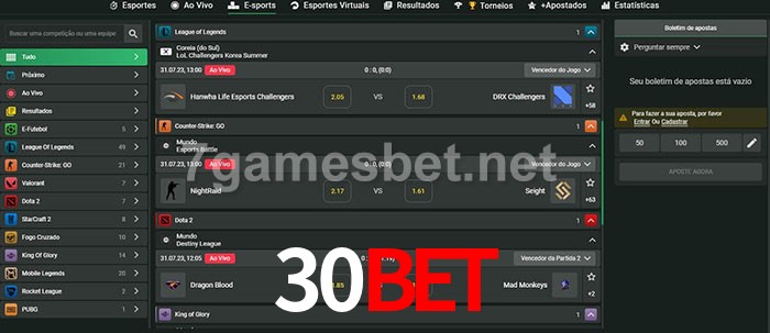 O 30Bet oferece uma grande seleção de opções de apostas em e-sports com probabilidades competitivas